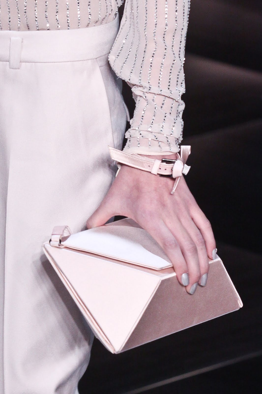 Os materiais usados eram nobres, como cetins, gabardines, couro e organzas foram os escolhidos para as criações dessa coleção, e as cores foram o preto – outra tradição -, off white, quartzo rosa, safira e esmeralda.